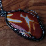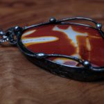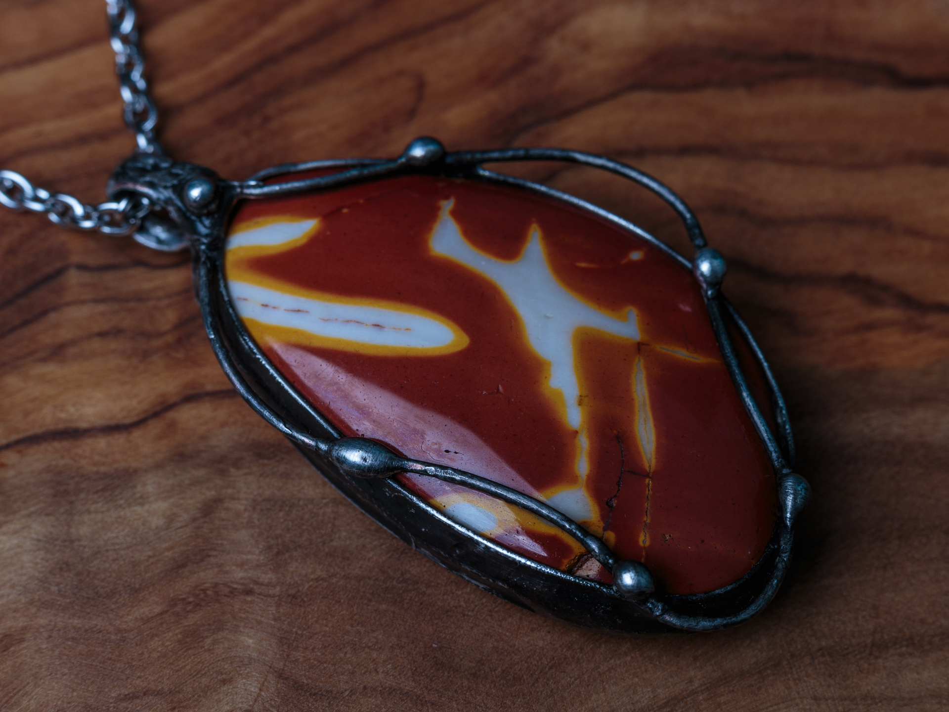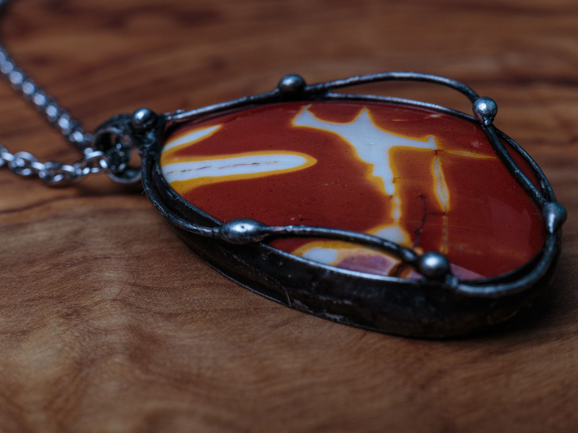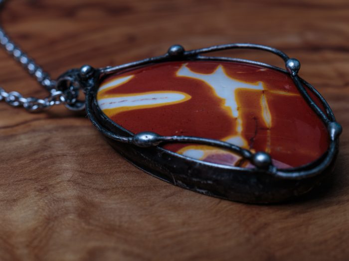 Šperk je vyrobený z bezolovnatého cínu s mědí. Kámen mookait, země původu Austrálie. Občas doporučuji natřít kovové části špěrku olivovým olejem.