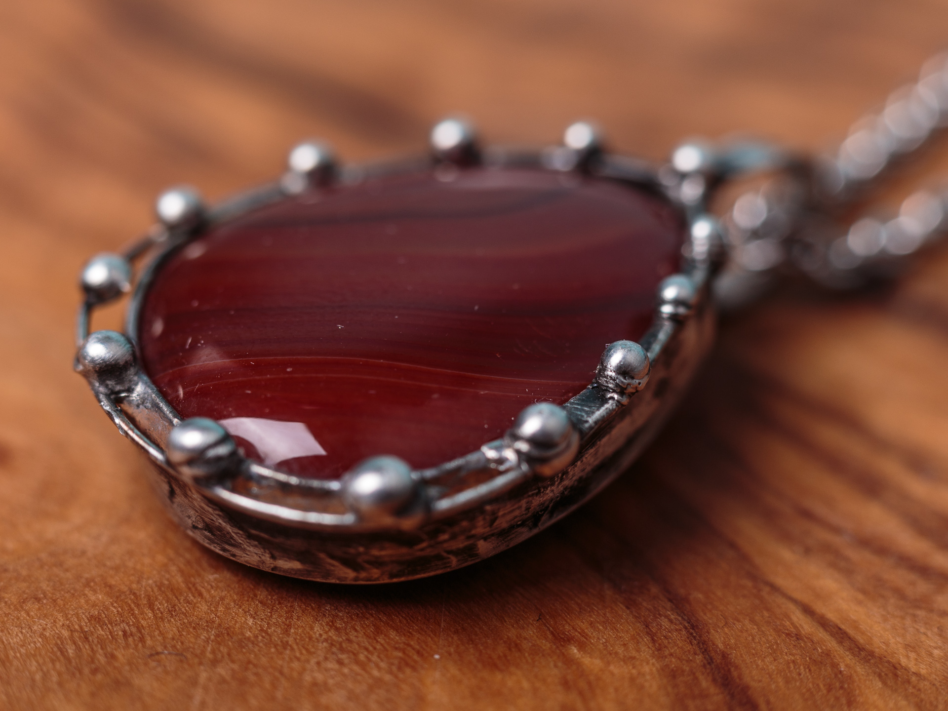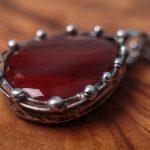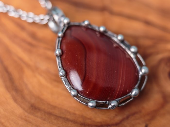 Šperk je vyrobený z bezolovnatého cínu se stříbrem. Kámen je Karneol. Občas doporučuji natřít kovové části špěrku olivovým olejem.