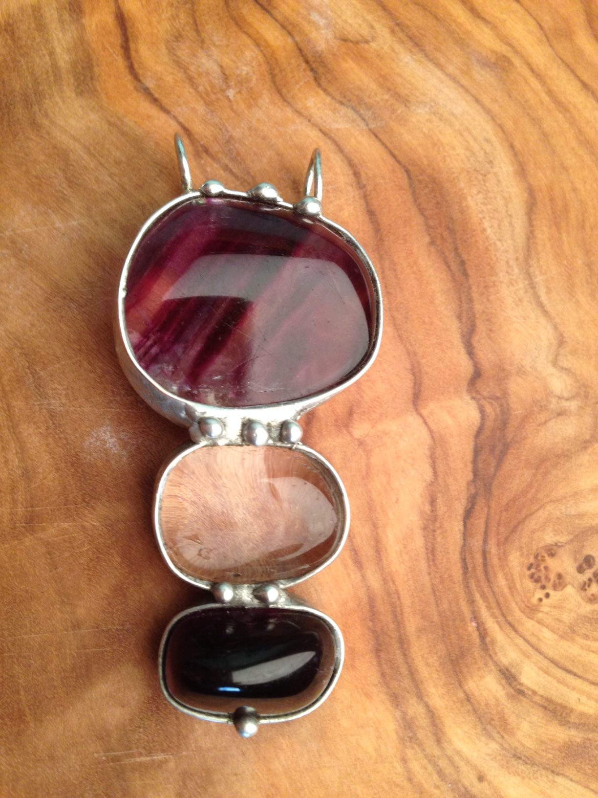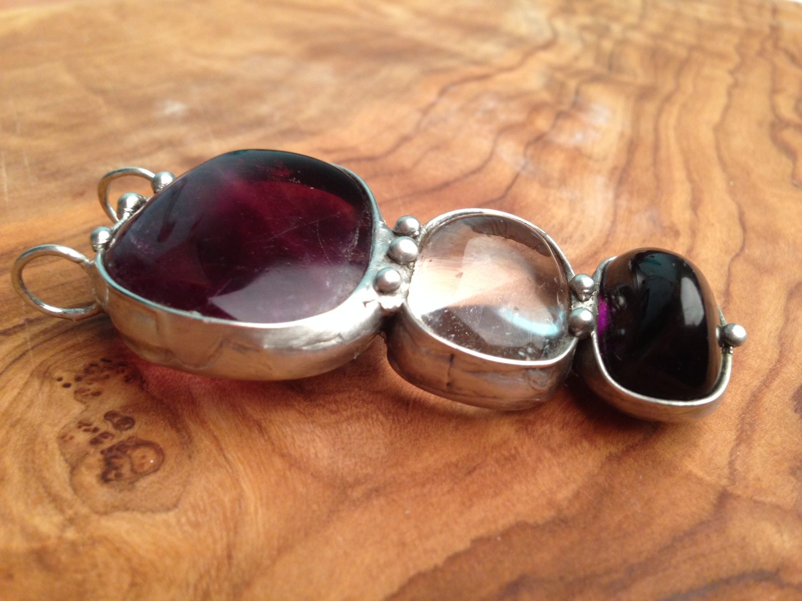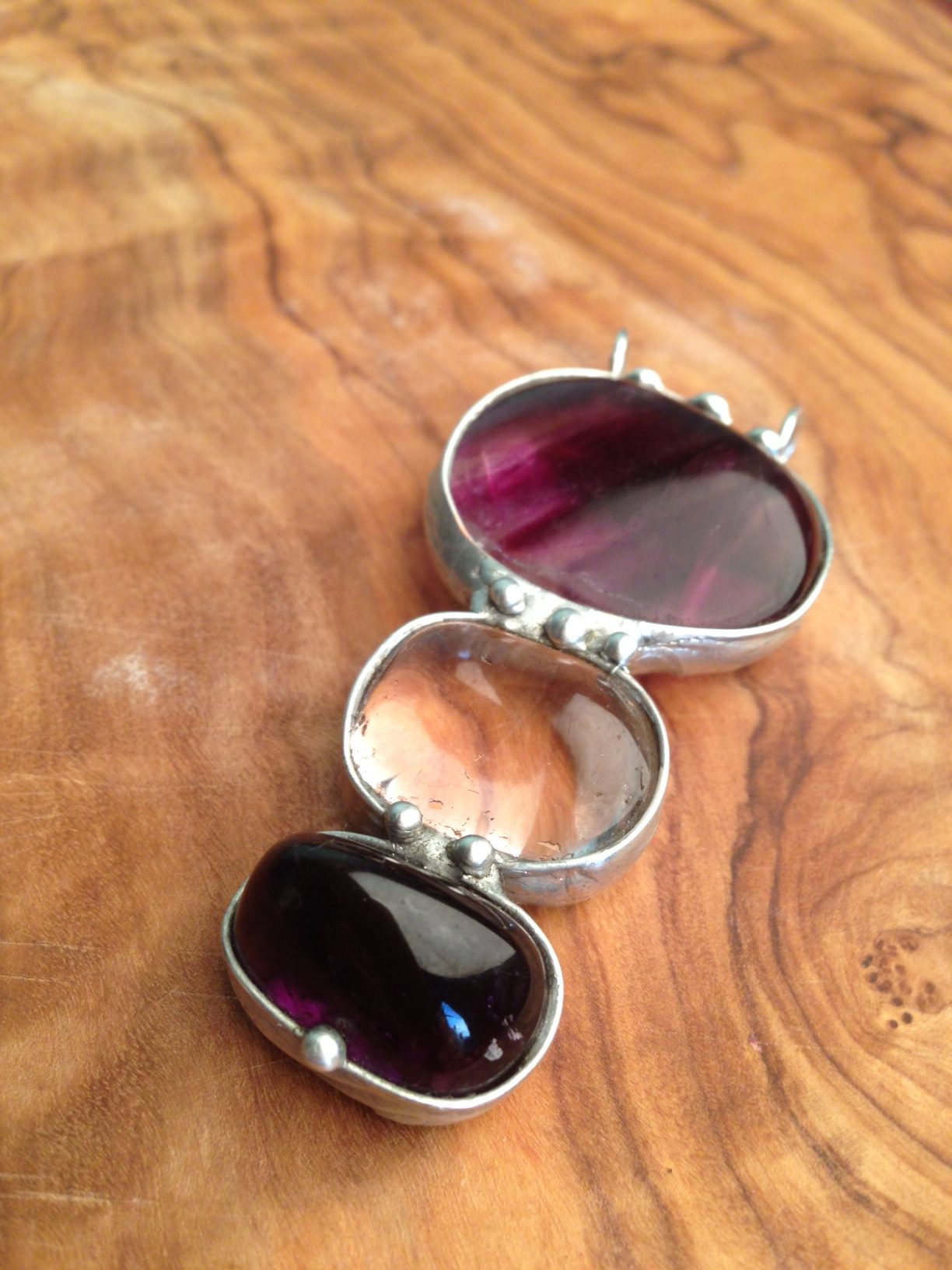 Šperk je vyrobený z bezolovnatého cínu se stříbrem. Kámen fluorit a křišťál. Občas doporučuji natřít kovové části špěrku olivovým olejem.