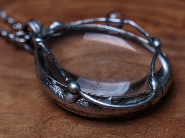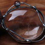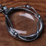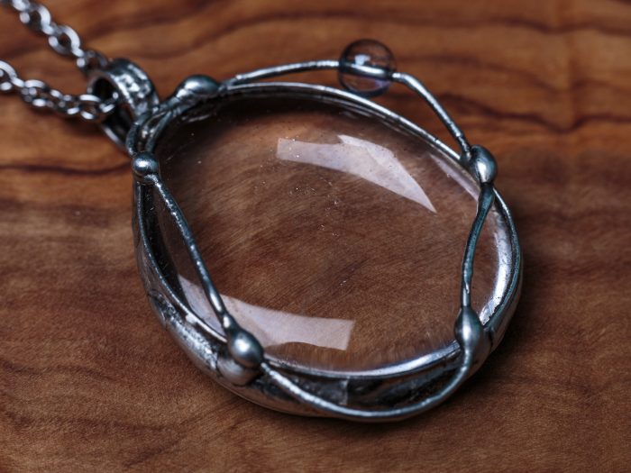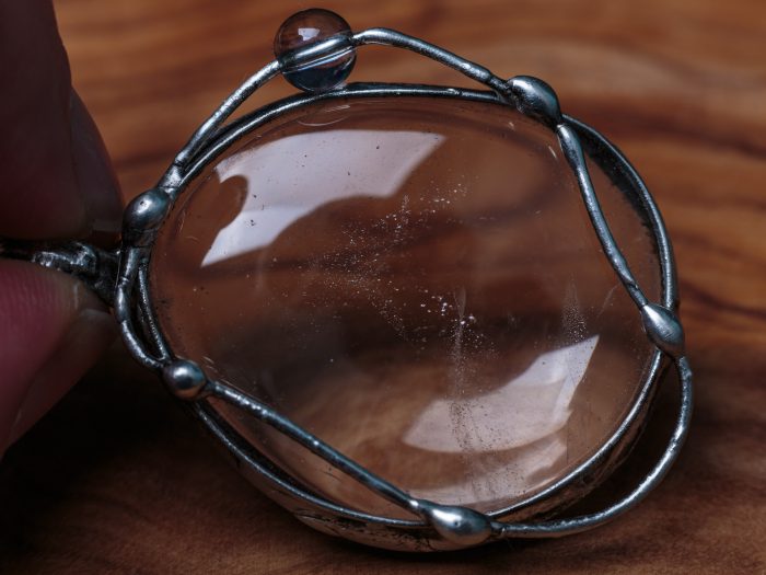 Šperk je vyrobený z bezolovnatého cínu s mědí. Kámen i korálek je křišťál. Uvnitř kamene jsou vzduchové bublinky, jinak je krásně průzračný. Občas doporučuji natřít kovové části špěrku olivovým olejem.