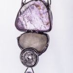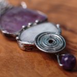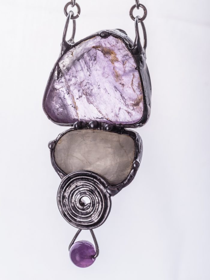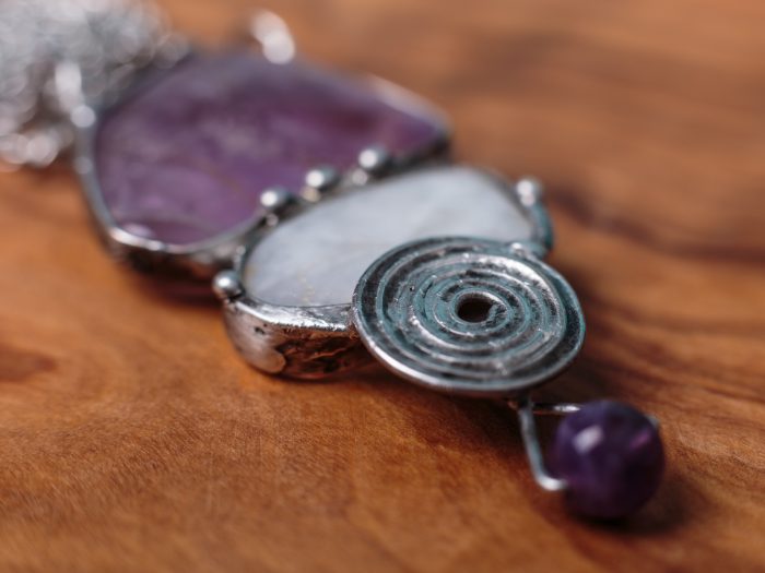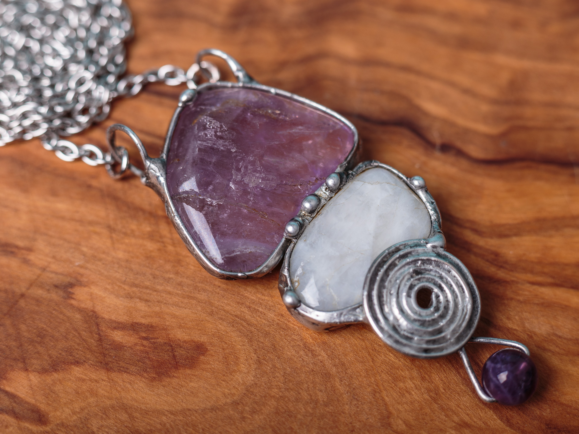 Šperk je vyrobený z bezolovnatého cínu se stříbrem. Bílý je Měsíční kámen, fialový kámen a korálek je Ametyst . Řetízek je z nerezové oceli. Občas doporučuji natřít kovové části špěrku olivovým olejem.